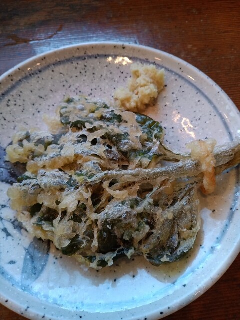 トッピングで取った「ツルムラサキの天ぷら」は、衣がカリッとしていて、これもおいしかった。