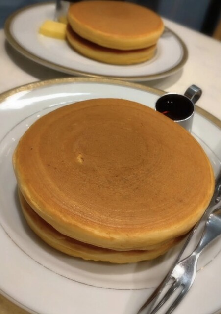 ドリンクと共に銅板焼きのホットケーキが有名、