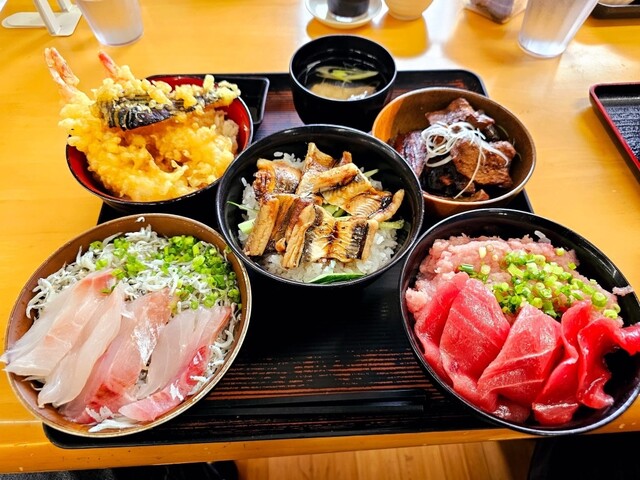 この日は①マグロ&ネギトロ丼②タイ&しらす丼③穴子丼④天丼