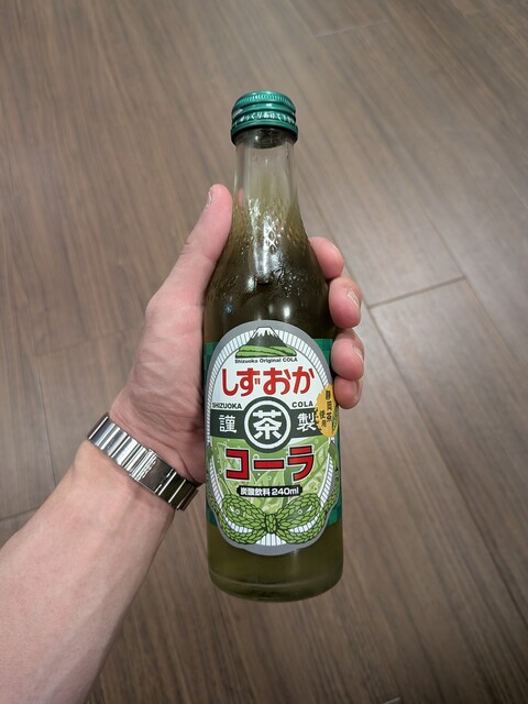 あと当館特有かもですが、温泉上がりの一杯の飲料が自販機だけではなく、万博おゆばで初めて目にした気になるサイダーがずらり陳列ヽ(^o^)丿 さくらコーラ・しずおかコーラー・富士山ゆずサイダー・赤富士サイダー・シャインマスカットサイダー・静岡いちごサイダー・山梨ぶどうサイダー・静岡みかんサイダー・その他多種類....と勢揃いでした( `―´)ノ どれも200~220円!! 今回は“しずおか謹茶製コーラ”をいただきました(220円)