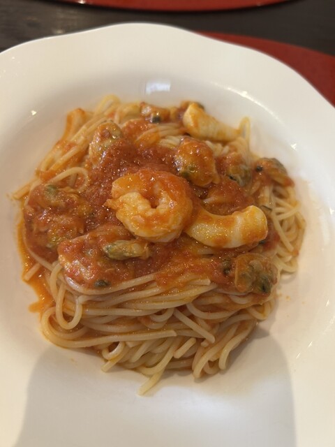 普通の一軒家の玄関のような入り口です。写真の内容で1,200円。ランチは安いと思います。テーブルは4つか5つ、近所の女性の井戸端会議で賑やかでした。海鮮パスタを頂きました。味はごく普通です。