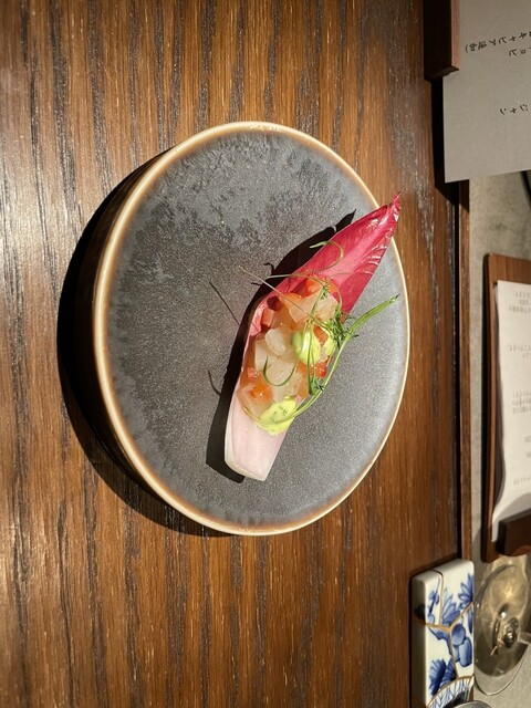 この日のコースは、和韓仏の要素がそれぞれの皿に入りつつ、味付けは分かりやすく、食べ進めやすい内容でした。主役として印象に残ったのは、提供順で2年熟成メークインアンチョビ、天草大王の、黒豚 フォアグラ ちりめんキャベツの炊き込みご飯です。2年熟成メークインアンチョビは、じゃがいもの甘いニュアンスにアンチョビの塩気が重なり、口当たりがなめらかでした。クリームの濃さはありますが量が適量で、スプーンが止まりにくい仕立てです。天草大王は、外側がパリッとして香ばしく、中はしっとりした食感でした。にんにくと醤油のソースは強すぎず、鶏の味が分かりやすいです。黒豚とフォアグラの炊き込みご飯は、目の前で混ぜて提供され、フォアグラバターの濃さがご飯全体に広がります。鮪節と小豆が入っていて、食べ進めるうちに味が単調になりにくく、最後まで食べやすかったです。少人数で落ち着いて会話を楽しみたい人や、フレンチを軸にしながら少し違う組み合わせを試したい場面に向いています。季節を変えてまた伺い、同じ店で内容がどう変わるかも見てみたいです。