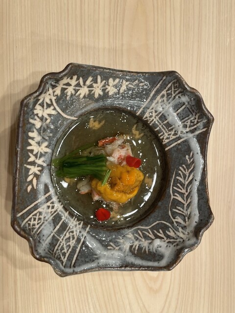 最初のズワイガニ餡掛けは、鰹出汁が土台となり、ズワイガニの甘みとバフンウニの濃さが素直に伝わってきます。せりのおひたしが添えられ、香りが加わることで口の中が単調になりません。続く煮蛸は佐島産で、箸を入れると抵抗なく切れ、噛むほどにたこの旨みが出てきます。柚子の香りもよく、里芋のほくっとした食感が全体を受け止めていました。青森県蝦夷鮑は4時間かけた火入れで、厚みがありながら歯切れがよく、食べ進めやすい状態です。肝ソースには生クリームが使われ、肝特有の強さを前に出さず、口当たりとコクを意識した仕上がりでした。そこから鮑の肝ソースリゾットへ続き、シャリを使ったリゾットは肝の旨みを感じつつも口の中に残り過ぎません。