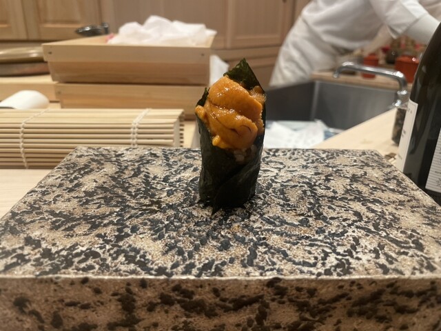 握りに入ってからは、宮城県塩釜産本鮪大トロの脂の甘さが分かりやすく、口の中でほどけていきます。墨烏賊は包丁が細かく入り、歯切れが良好。春子鯛は身の柔らかさと味付けの加減が安定しており、喉黒の昆布〆は昆布の旨みが控えめに寄り添う形です。本鮪赤身漬けは味の入り方が強すぎず、噛むほどに旨みが増していきます。大トロ炙りは塩で提供され、脂の甘さが明確に感じられました。牡丹海老は炙りによって香りと甘みが立ち、雲丹も量に対する満足感があります。和牛雲丹は岩手牛サーロインを使い、肉の旨みと雲丹の濃さがぶつからず、自然に一体となっていました。最後の鮪のおはぎまで無理なく食べ切れる量で、全体を通して食べやすさが意識されています。