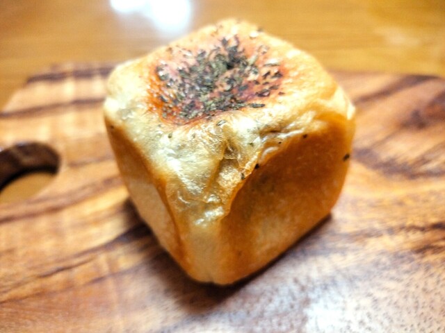 焼きカレーパンはキューブ型。立方体の形が印象的で見た目のかわいらしさに目がひかれるが、具の入り方が均一なので最後のまでしっかりカレーの味が続く。食べやすいフィリングでパン生地の美味しさも感じる。