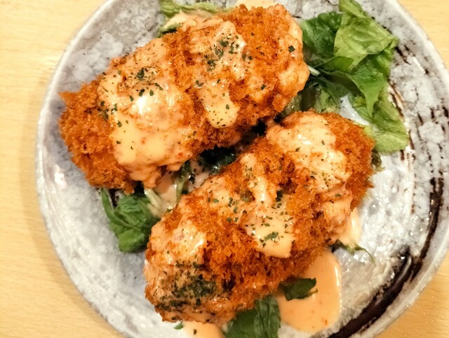 「粉雪チーズの和牛炙りユッケ」「クリーミー明太コロッケ」「うずまき唐揚げ」「メヒカリの南蛮漬け~スペイン風~」など、酒のアテと揚げ物で美味しくお酒がすすむ。