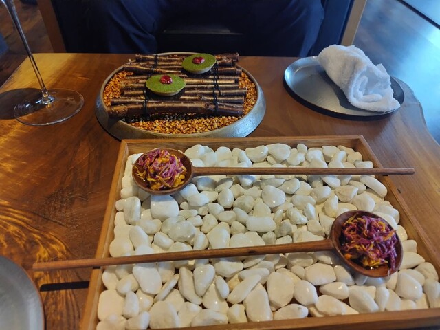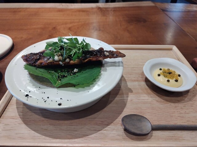 藻屑蟹の内子を菊花とともに和の出汁で寄せ、猪リエットのタルトにはセロリパウダーやマタタビの酸味を効かせた一品。さらにジビエソーセージのアメリカンドッグは黒ニンニクの発酵の深みで一気に洗練される。