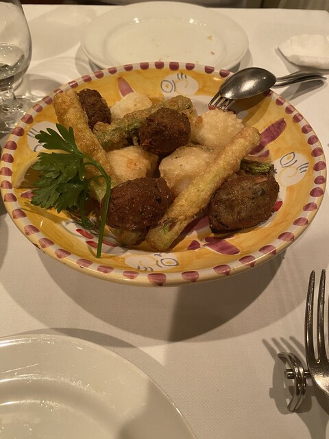 衣は極めて軽く、揚げたての香ばしさが広がります。中にはモッツアレラチーズが詰められており、ほんのりとした塩気とズッキーニの花の繊細な香りが絶妙なハーモニー。こちらも過剰な味付けを避けた、素材を活かす一皿でした。