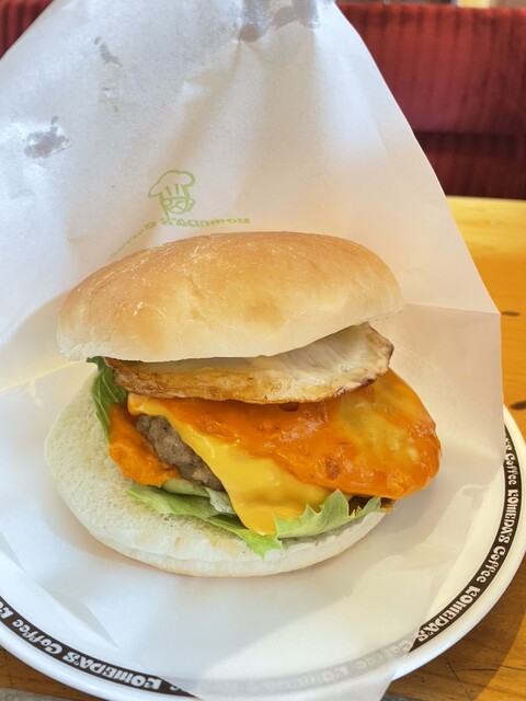 とにかくでかい。入っているのは、ハンバーグ、エッグオムレツ、チーズ、レタス。玉ねぎが入っており食感がアクセントになっています。ソースはケチャップ強めのオーロラソース。辛子がアクセントになっています。満足感が高いです。