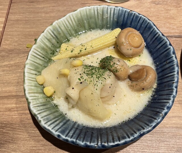 はいっているものは、ロールキャベツ、ヤングコーン、マッシュルームです。白濁したスープで洋風に仕上げてあります。ロールキャベツが推しです!タネの肉肉しさと鶏スープのコク、まろやかさが合わさって最高です。