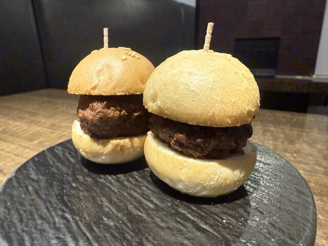 次に登場したのは、黒毛和牛100%の手乗りハンバーガー。見た目はかわいらしいサイズですが、一口食べると和牛ならではの肉感がしっかりあり、小さいながらも満足度の高い一品でした。