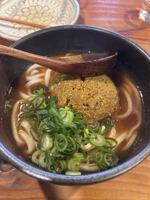 出汁の効いた和風カレーで、スパイスは控えめながらもコクがしっかりあって、最後まで飲み干したくなるタイプ。うどんはやや太めでコシがあり、カレーがよく絡みます。とろみもちょうどよく、寒い日には特に染みる一杯でした。