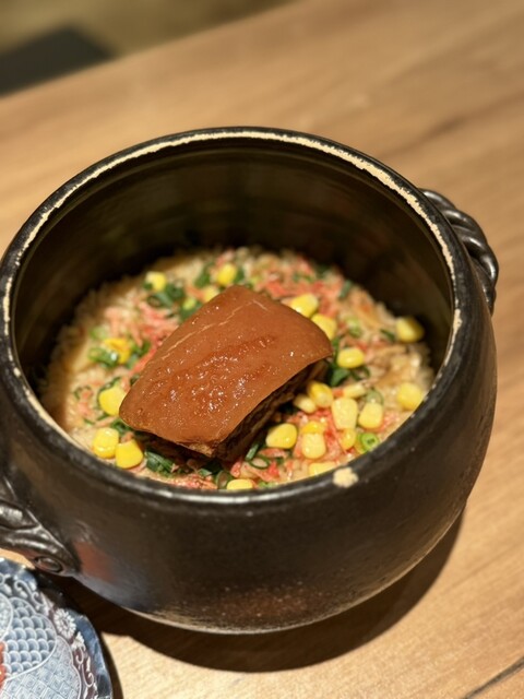 そして、〆に頼んだ「沖縄の土鍋ご飯 島豚のラフテー」も衝撃的な美味しさ。アツアツの土鍋で炊き上げられた炊き込みご飯に、とろっとろに煮込まれた島豚のラフテーが贅沢に乗っていて、旨みが凝縮されています。また、「てびちで出汁とるコク旨宮古そば」も、豚足のてびちから取ったという出汁が濃厚で、まさにその名の通りコクと旨みが凝縮された一杯。どれもこれも、宮古島の食のレベルの高さを感じさせてくれる逸品ばかりでした。