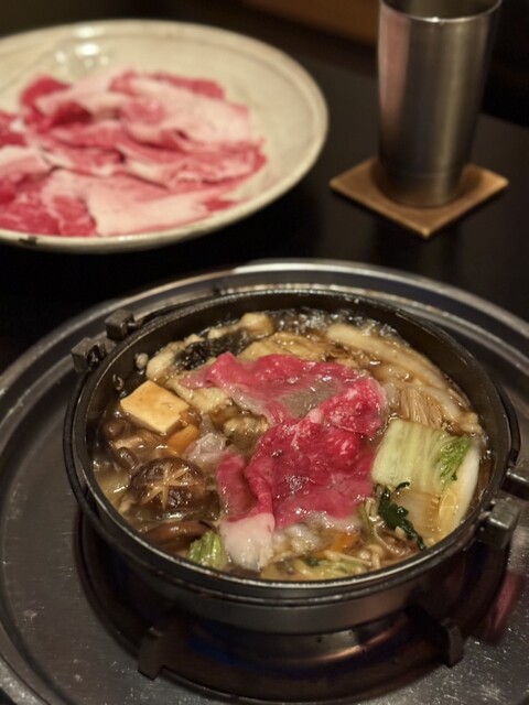 国産鰻60gを合わせた珍しい組み合わせで、甘辛い割り下と和牛の脂の旨み、鰻のコクが重なり食べ応え十分。