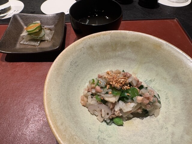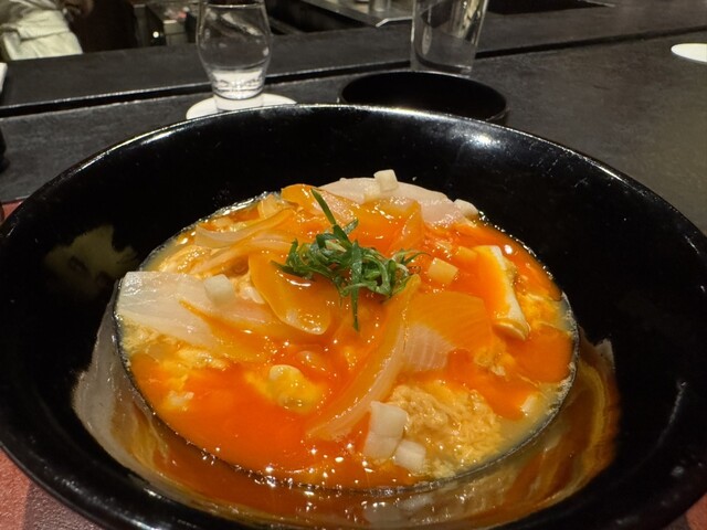 〆のご飯の鶏そぼろご飯や親子丼も毎回アレンジされており、今回は新玉ねぎ、ウルイ、新生姜と春を感じる親子丼。お腹一杯でしたがサクッと食べてしまいました。
