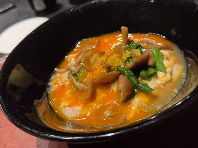 〆のご飯の鶏そぼろご飯や親子丼も毎回アレンジされており、今回はナメコ、ウルイ、菜の花と春の近づきを感じる親子丼。お腹一杯でしたがサクッと食べてしまいました。