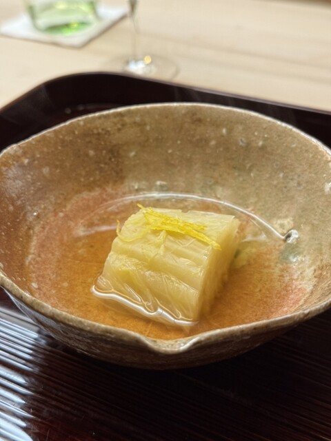 小鉢は蕪の錦秋蒸し。錦秋蒸しは蕪を亀甲の型でのご提供。炭火で火入れした車海老が蕪の中に。炭火の香りがほんのりと漂い銀餡との相性が素晴らしい。