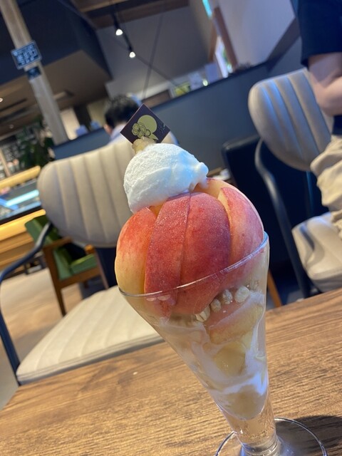桃がまるまる2玉くらい入ってる桃パフェ、食べ応え十分で最後まで桃を楽しめます!