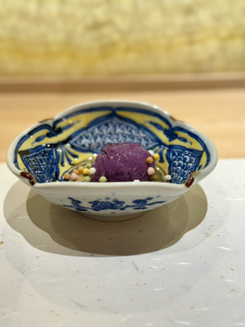 紫芋の豆腐。芋の風味がしっかりしていて、カリカリしたひなあられのようなトッピングとの相性が抜群。