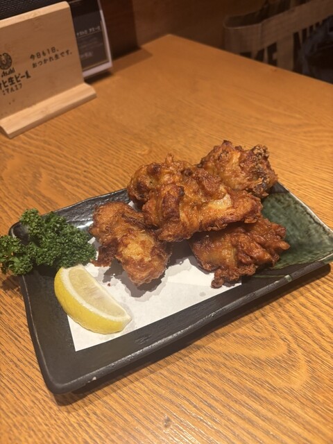 クラフトマーケット特製唐揚げはジューシーで衣サクサク、ビールとの相性抜群です。