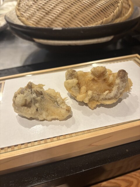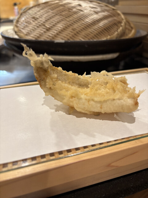 天麩羅は、カウンター席の目の前で、旬の食材を中心に一品ずつ揚げたてで提供してくださります。