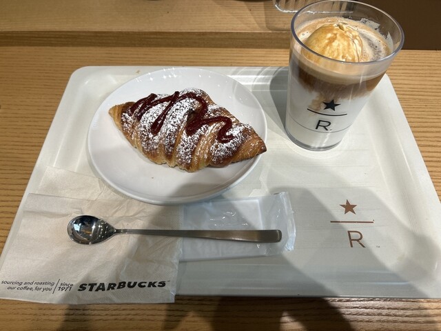 コルネッティは意外と大きくて、1個でも十分満足度が高いです。ベーカリー方式で可愛いトングで取るのも楽しい✨受け取り口の付近にドリンクトッピングコーナーがあるのも珍しい!いろんな組み合わせを試したくなっちゃうスタバです。