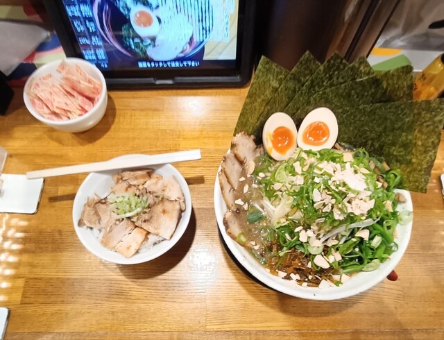 今日も『豚骨煮干しらーめん』(11種類トッピング追加)と『チャーシューごはん』(大盛)を注文致しました。
