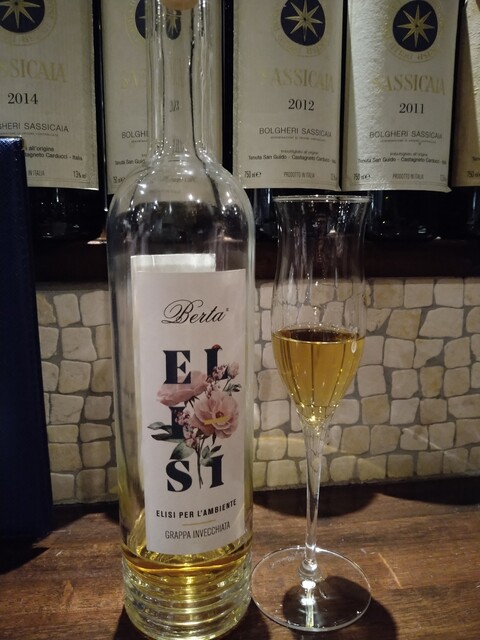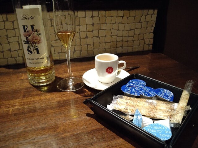 本日最後の飲み物は、スタッフの方に教えていただいた飲み方で、ベルタ社のグラッパ「Elisi」とエスプレッソを。そのままでも香り高く飲みやすいグラッパですが、エスプレッソに注ぐと風味が一変。コーヒーの香りが立ち、度数の強さが心地よい余韻を生み、食後の時間を贅沢に締めくくってくれました。