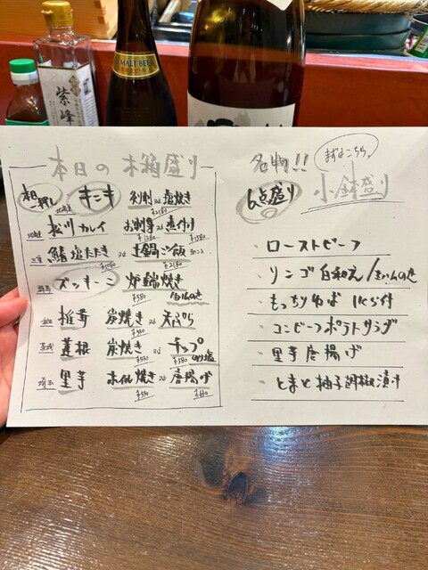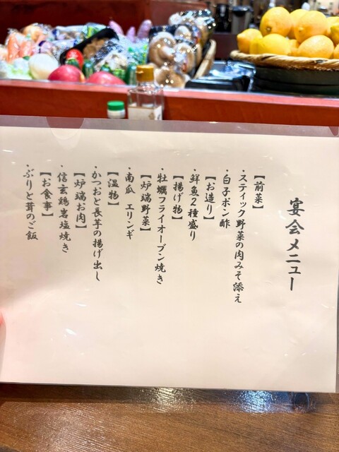 今回はコース予約のため注文できませんでしたが、お店の名物だという「本日の木箱盛り」(好きな具材を選んで炉端焼きにしてもらえる)や「名物の小鉢盛り」についても親切に紹介していただき、アラカルト利用への期待も高まりました。