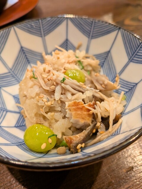 土鍋で提供されます。大きな切身のぶり、エノキなどのキノコ、そしてアクセントの銀杏が入った炊き込みご飯。ぶりの脂ときのこの香りがご飯に染み渡り、銀杏のほろ苦さが大人な味わいを演出していました。