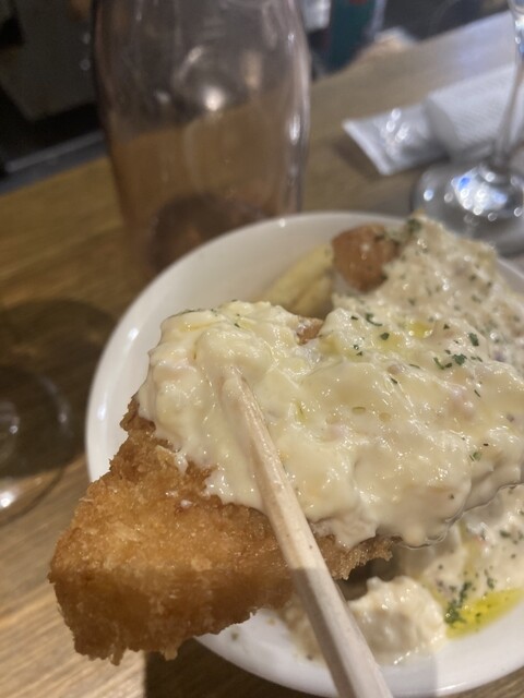 白身魚のフライとポテトフライの上にたっぷりのタルタルソースがかかっていました!