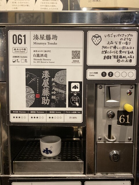 お酒の特徴が説明にかかれていて、気になるお酒を選んでコインを入れてボタンを押すとおちょこにお酒が注がれます!