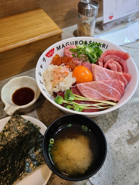 渋谷で美味しい海鮮丼が食べたくて「まぐろとシャリ」さんへ。今回いただいた贅沢まぐシャリ丼、名前の通り本当に豪華でした!中トロ・大トロ・赤身の鮮度がどれも良く、ねっとりした旨みがしっかり感じられます。真ん中の濃厚な卵黄を絡めると味がまろやかになって、さらにご飯が進む…!カニほぐし身やいくらまで乗っていて飽きずに食べられる丼でした。味噌汁と海苔が付いてくるのも嬉しいポイント。渋谷でクオリティの高いまぐろ丼を探している方におすすめです。
