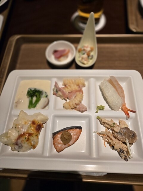 シェフが取り分けてくれるローストビーフはお肉が柔らかくて箸でも切れるほとでソースとトッピングを自分で選べて何枚食べても飽きがこないです。