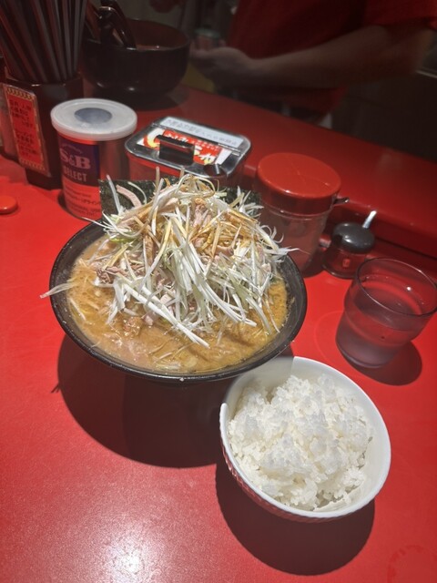 写真はネギチャーシュー麺大盛り+ライス。「店内写真撮影NGでラーメンの写真のみ1枚撮影可能です!誤って写真撮影しないように注意!」