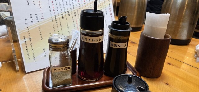 テーブルには特製ソース、しそドレッシング、ハーブ岩塩、カラシが常備。
