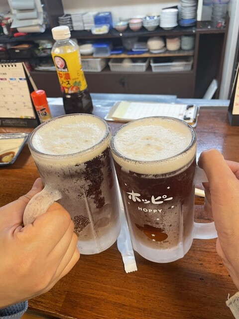 三冷ホッピー黒を最初に注文。ジョッキで、キンキンに出てくる。