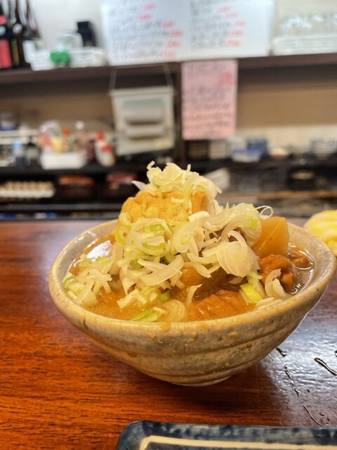 店主のしろうくんに特にオススメをきき、モツ煮込みを注文。大根や人参が大きめに入っているが、とても柔らかく、モツとの相性もバッチリ。濃厚な味噌の味がいい。モツもたくさん入ってて、美味しいかったぁ❤️