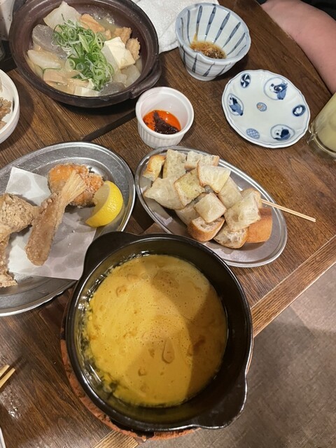 料理は、中落ち揚げ。色んな魚が入っていて、ボリューム満点。白子ポン酢、モツ煮、出汁巻き、イカワタホンデュ、