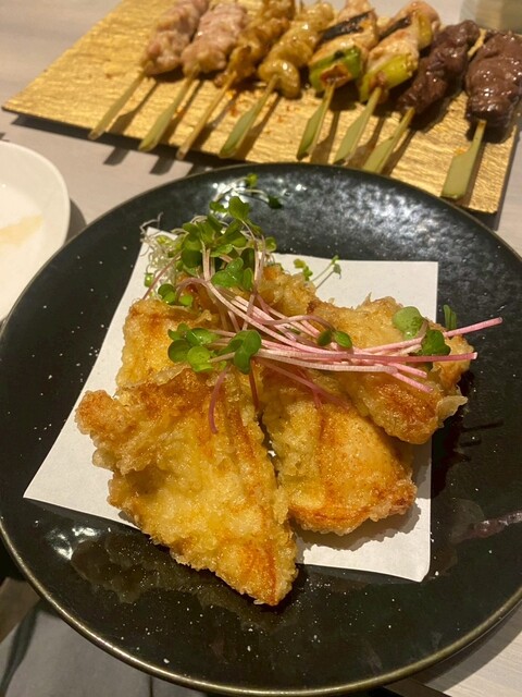 地鶏タタキとササミのタタキは、鮮度の良さが一口で伝わる逸品。しっとりとした食感と上品な旨みがあり、薬味とのバランスも絶妙で、お酒が自然と進む。とり天は衣が軽く、鶏のジューシーさを邪魔しない仕上がり。山芋キムチは箸休めとしてちょうどよく、ポテトサラダもどこか家庭的でほっとする味わいだった。