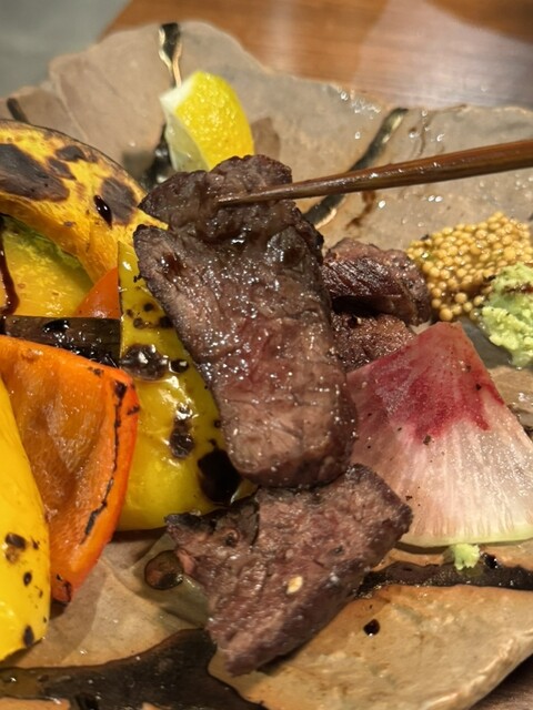 特におすすめなのが「なにわ黒牛 かいのみ炭火焼き」。絶妙な火入れで柔らかく仕上げられており、お酒が進みます。