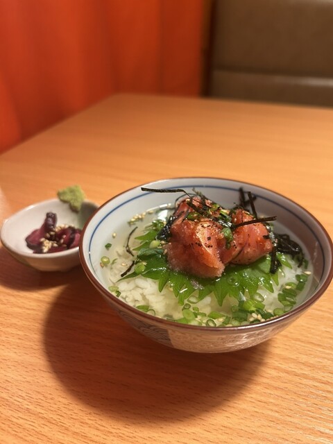 〆には「明太お茶漬け」を注文。だしの香りがふんわり広がり、その中に明太子のほどよい辛みと旨味が加わって、最後まで飽きずに食べられます。海苔・ネギ・大葉が良いアクセントになっていて、食事の締めとしてかなり満足度の高い一杯でした。