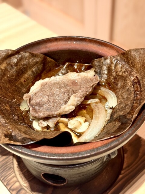 朴葉焼きは15分掛けてゆっくり火を通した淡路産の玉葱は甘くトロけて宮崎牛の柔らかく旨味の濃い肉質が出汁と溶け合って美味しすぎた。