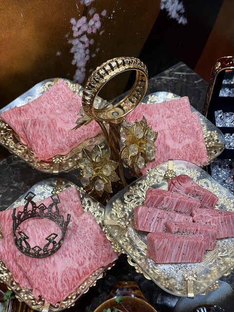 そしてメインのプリンセス台に乗った演出も凄いお肉の盛り合わせはサーロインの焼きすき・焼きしゃぶ、極上ヘレステーキが入ってる。