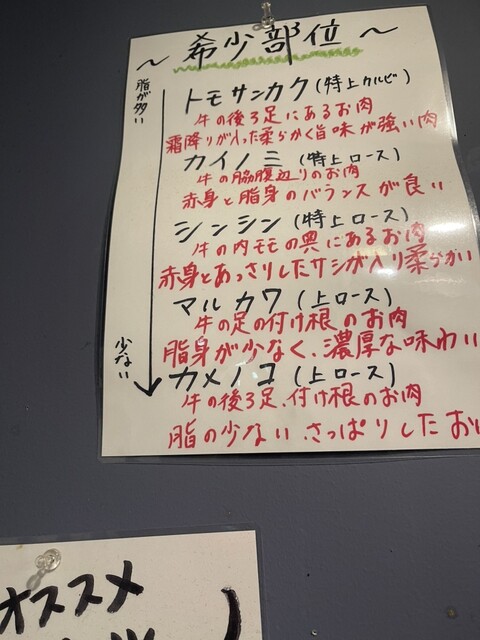 他にも希少部位の「トモサンカク」「カイノミ」「シンシン」「マルカワ」「カメノコ」を2切れずつ追加…店員さんが丁寧に説明をしてくれそれぞれの違いを味わいながら食べる事ができました。何だこのトロけるようなお肉は…!?くれぐれも焼き過ぎは厳禁です。
