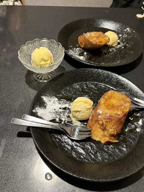 〆に「冨のラーメン」970円…食後のデザートに「超フレンチトースト」650円×2、「シャーベット」450円を注文!…ラーメンは魚介系のだしがベース、特にアゴだしが効いていて美味しかったです!スープまで飲み干してしまいました。フレンチトーストはフランスパンが使用されており甘くふわふわで絶品!シャーベットは彼女が1人で堪能!なんでもデザートは別腹との事で。。。(汗)