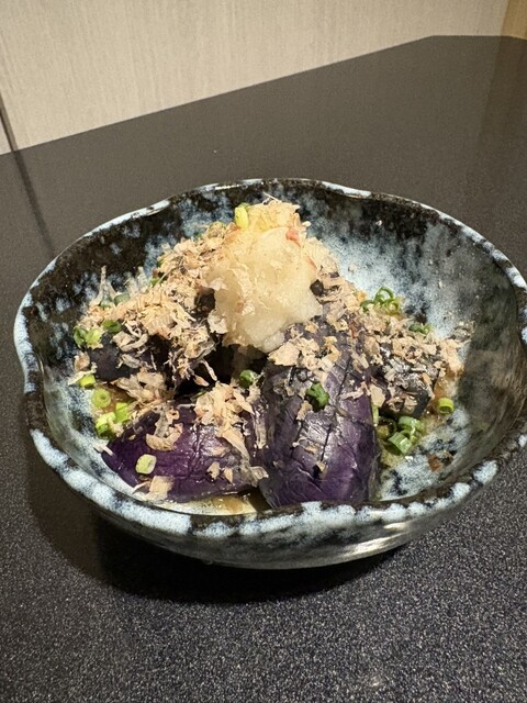 「茄子の揚げ浸し」680円、「冷たい長芋の梅炊き」520円を注文!…茄子の揚げ浸しは味がしっかりと染み込んでいて美味い!長芋の梅炊きも梅の風味が効いていて美味!