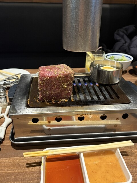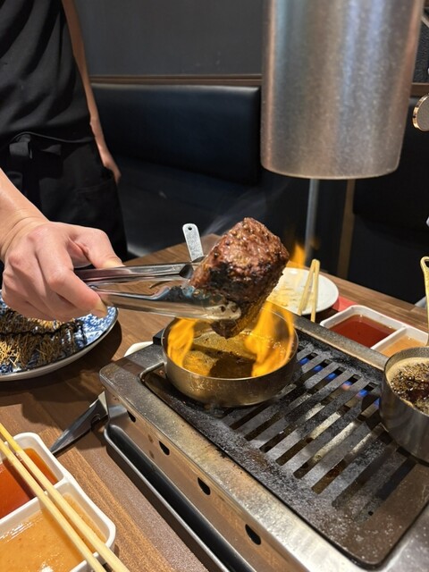 続いて登場したのは、名物「ごぉの赤壁 -レッドクリフ-」。200gの塊肉を店員さんが目の前で豪快に焼き上げるライブ感に、「わぁ、すごい!映画みたい!」と目を輝かせる彼女。焼き上がった瞬間、香ばしい香りが広がり、一口食べれば外はカリッと、中はしっとり。ガーリックバター甘だれをつけながら食べると思わず「これ、反則級だね…!」と二人で笑い合いました。