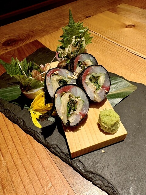 〆の「かず家のアテ巻き」968円は鯵の爽やかな旨みがきいていて、重くならず締めにぴったり。