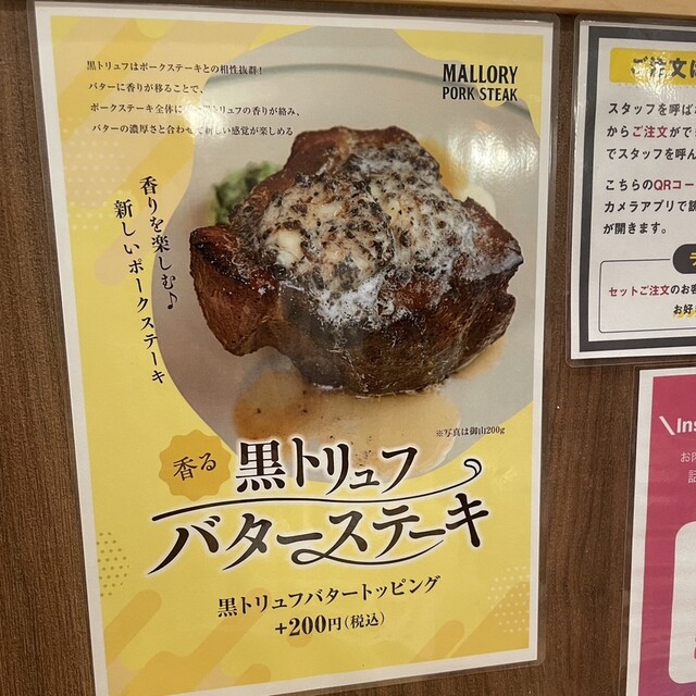 美味し過ぎて感動しましたマロリーポークさんに行きました!!ステーキって言っても豚やろ〜でお肉がパサパサの硬いイメージしかなかったので前から知ってても全然行かなかったのですが、食べログの高評価が多く投稿を見て店内に入りました!!